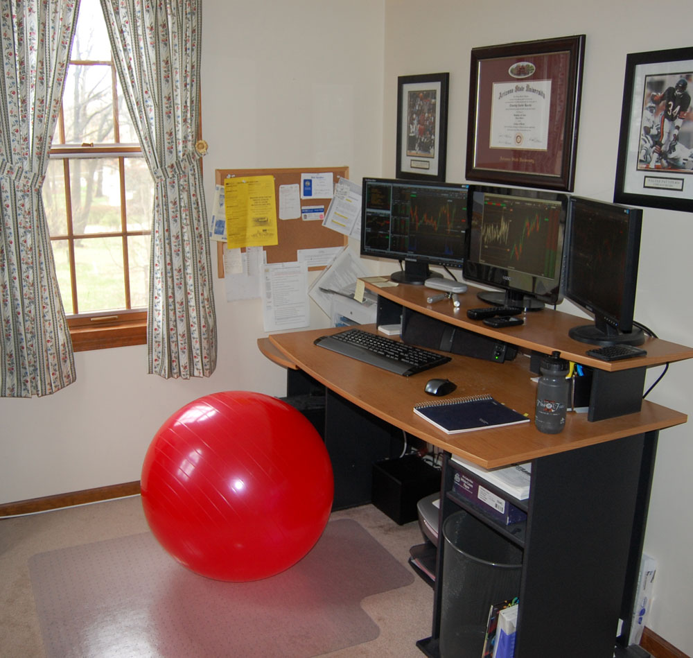 Once you have decided on a desk for your trading office you need to pick out an office chair. This is where the fun begins. There are some really creative office chairs on the market. One option (and the “chair” I chose to go with) is the exercise ball. That’s right, those big round colored balls you see in the gym.