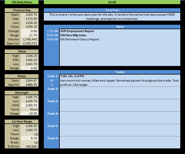 This spreadsheet acts as a checklist as I fill it out each night for the following day. During the trading day I record my trades on this sheet as well.