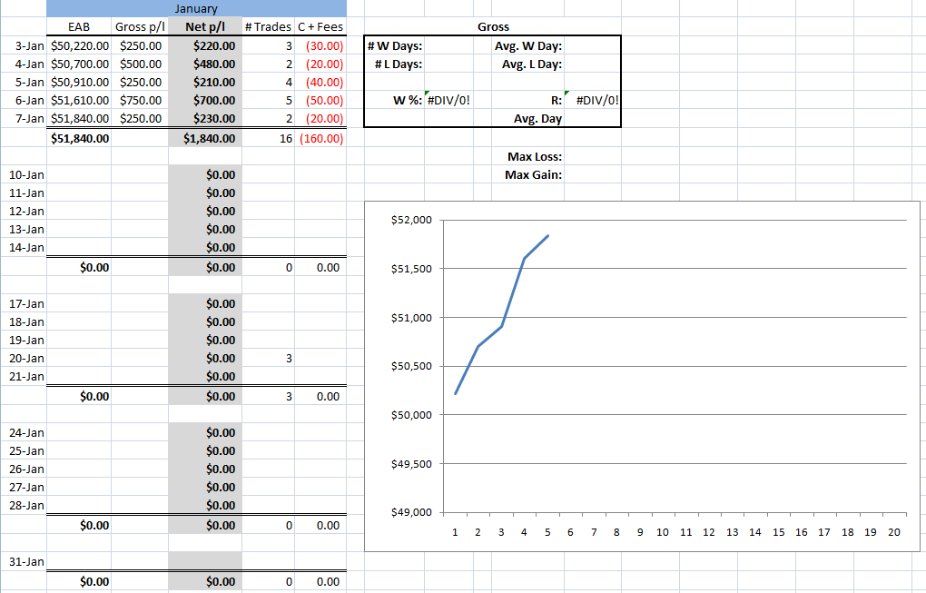 This report keeps the commission expense in check and helped me see that my biggest days were sometimes the days with the fewest number of trades. It also makes it clear that the month is made up of a few big days and a number of average days. On days when the market is providing quality setup after quality setup I continue to trade, days where the market is slow and I have a couple scratch trades I usually lock in gains that I may have and stop trading by 10:30 CST.