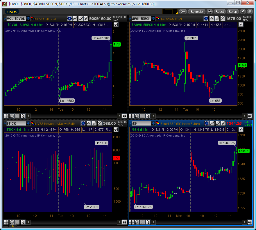 Here is another way to setup your Market Internals chart. In the top left we have the Breadth Ratio, top right AD Line, bottom left Tick, bottom right ES.